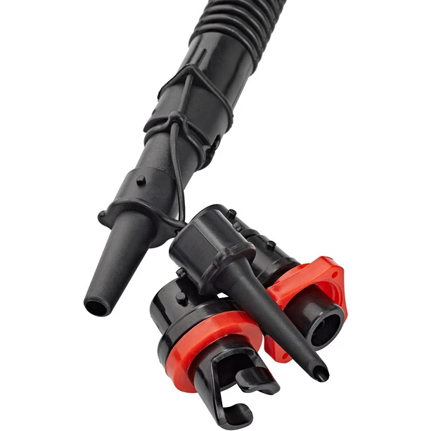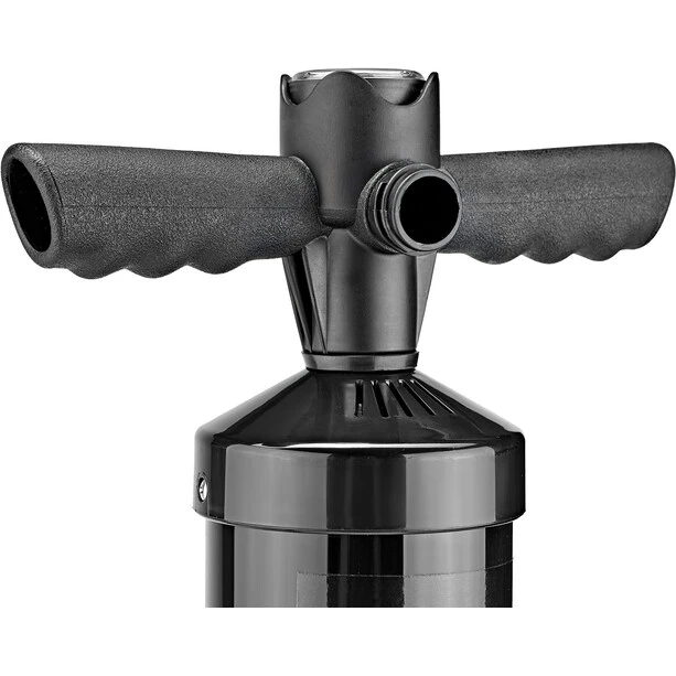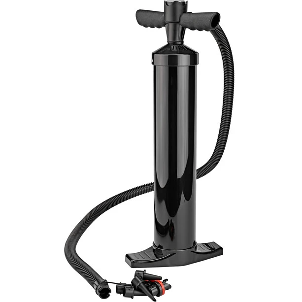 Thanks to its volume of three litres, particularly large inflatable objects such as swimming tyres, SUPs and paddling pools can be inflated in no time at all. The pressure indicator in the handle allows you to achieve the right air pressure so that you don’t pump too much or too little air inside. Compared to a classic foot pump, the double lift pump is much easier to operate because you can fix it to the ground with your foot and operate it with your arms. With the interlocking attachments you can use different valves from various manufacturers.